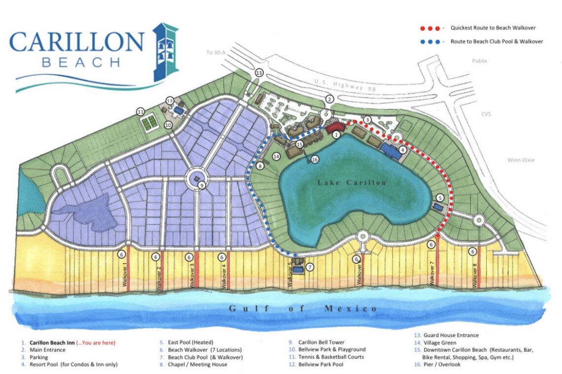 Carillon Beach Inn is located on the South Side of Highway 98, and the resort is pedestrian and bike friendly, making it easy to explore the community without a car. Golf cart rentals and bike rentals are available onsite. Pier Park is approximately 10 minutes by car, and Rosemary Beach is about 5 minutes away. Northwest Florida Beaches International Airport (ECP) is roughly 25 minutes away.