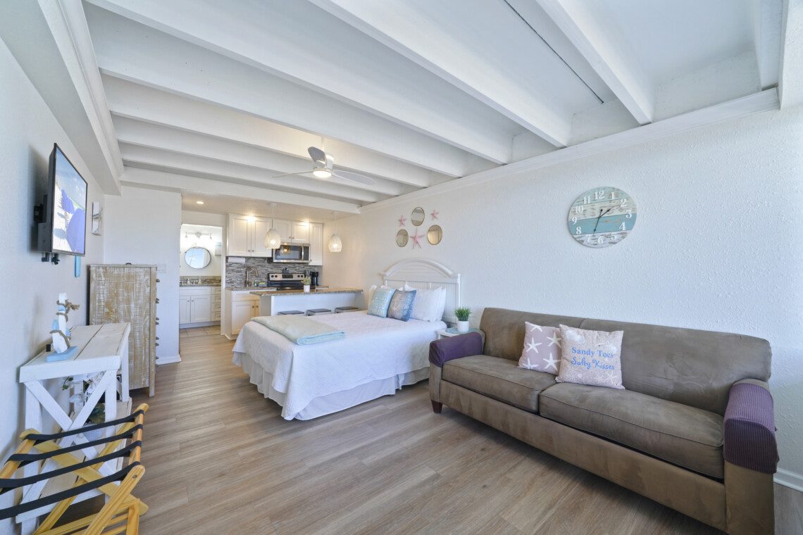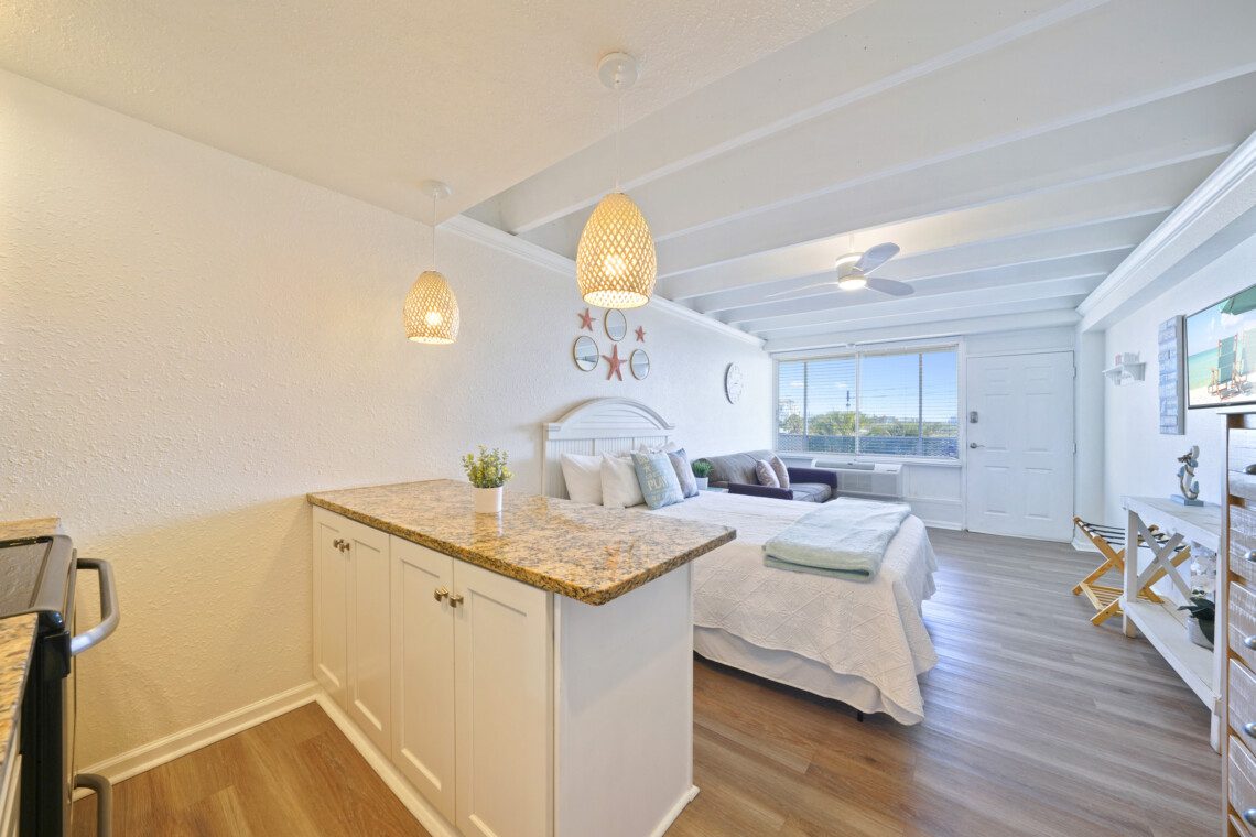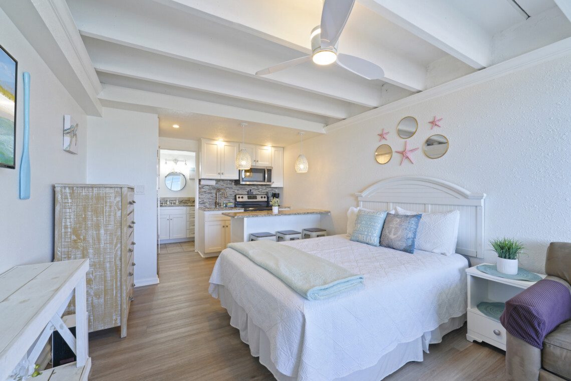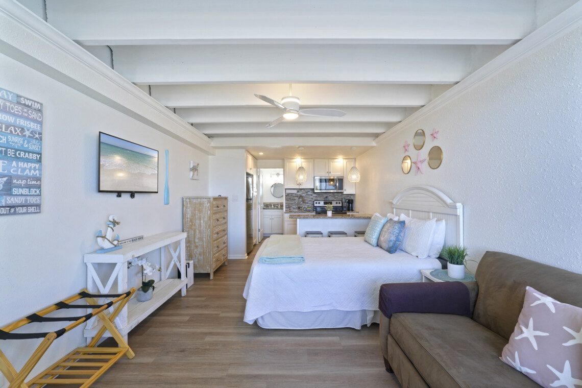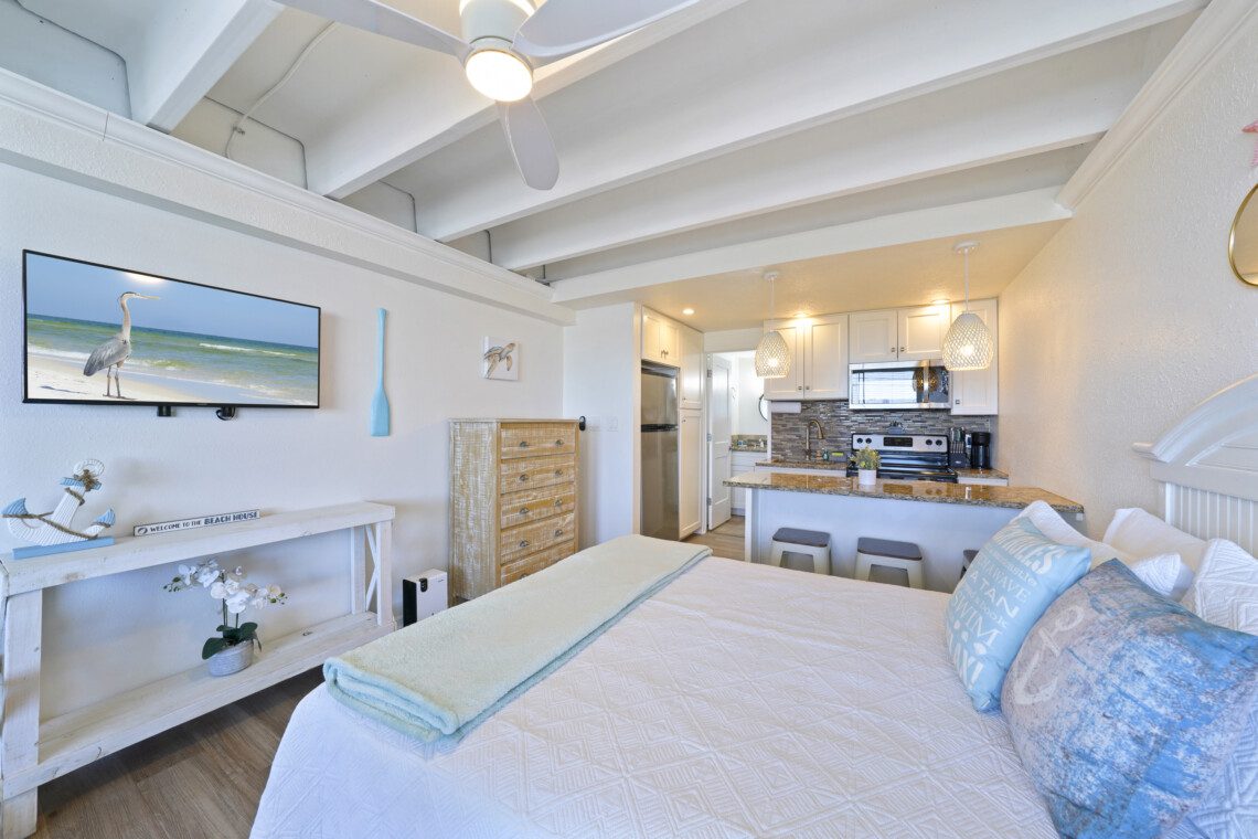 This 2nd floor unit is an open concept sleeping area, living space, and kitchen. There is a queen-sized bed and a queen-size sofa sleeper. Enjoy the sounds of the waves as you enjoy a home cooked meal on the granite kitchen island or kick back and watch a movie on the smart TV. The dresser by the TV provides plenty of space to unpack.