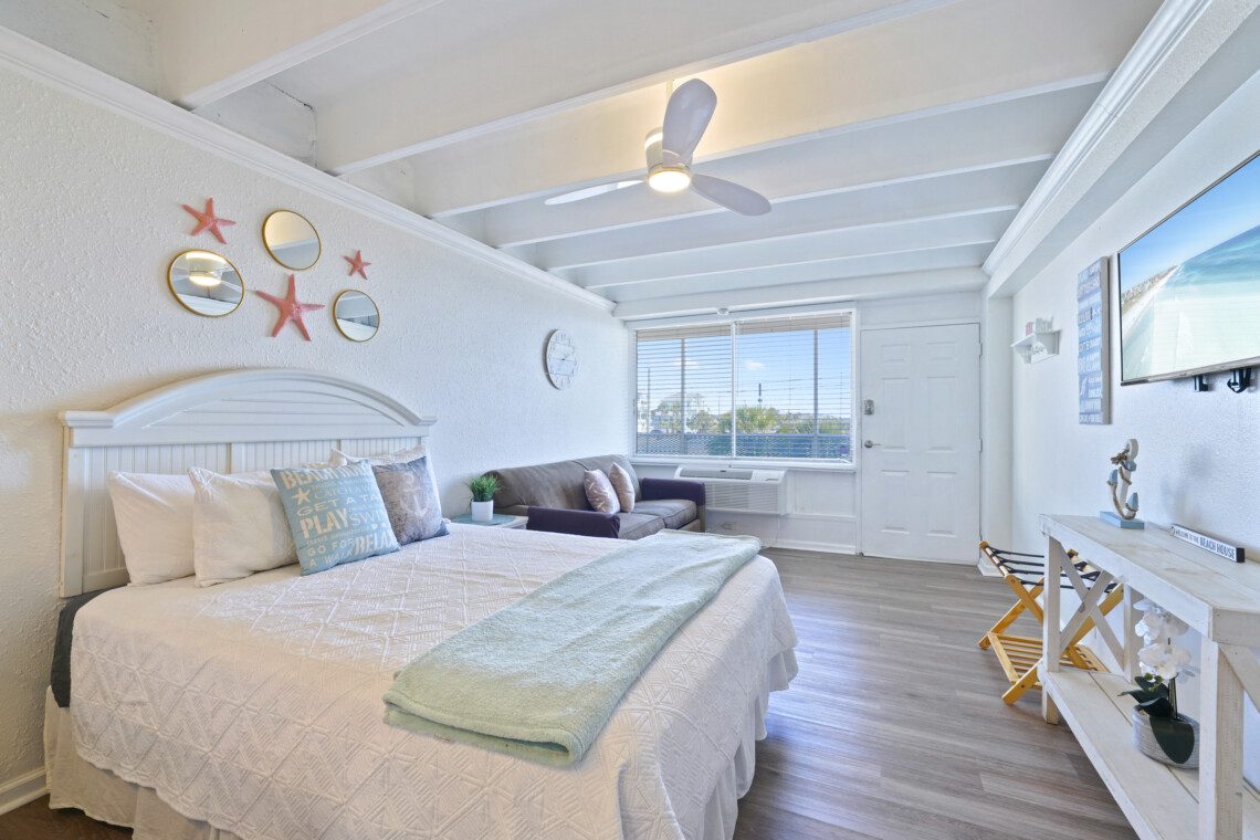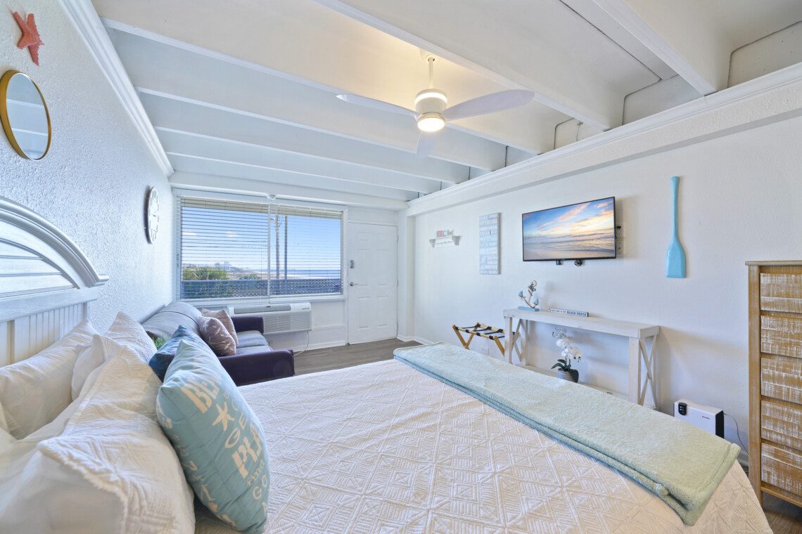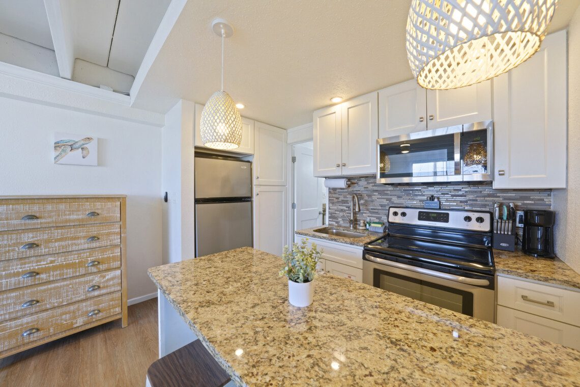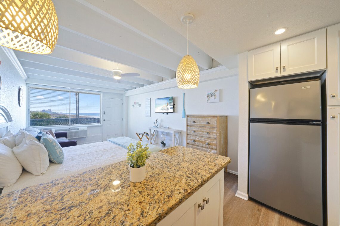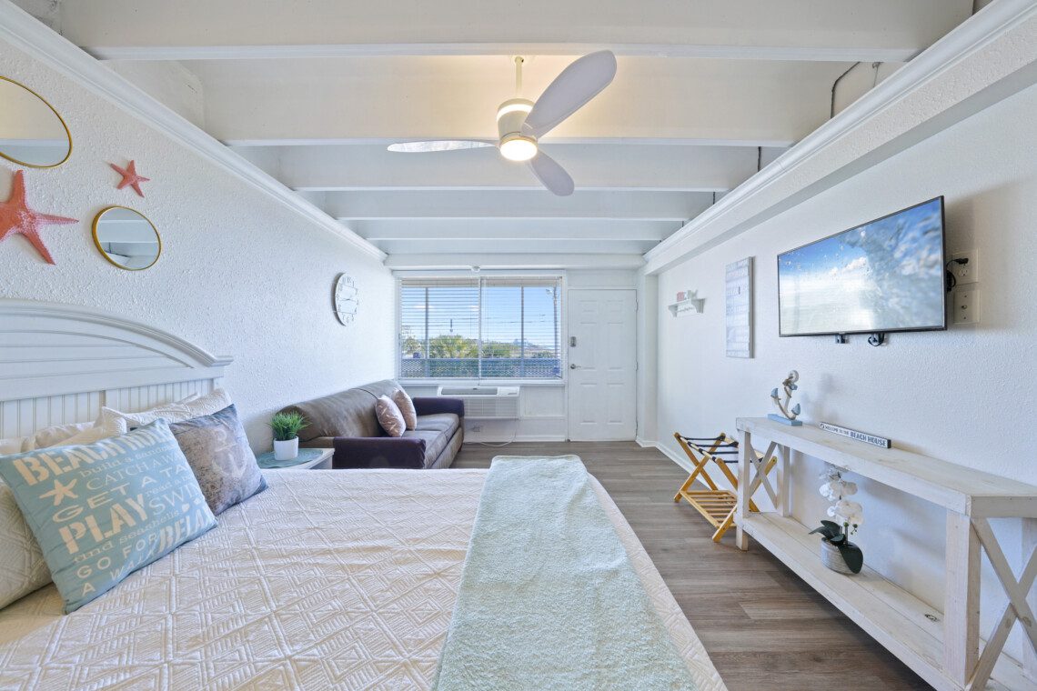 This 2nd floor unit is an open concept sleeping area, living space, and kitchen. There is a queen-sized bed and a queen-size sofa sleeper. Enjoy the sounds of the waves as you enjoy a home cooked meal on the granite kitchen island or kick back and watch a movie on the smart TV. The dresser by the TV provides plenty of space to unpack.