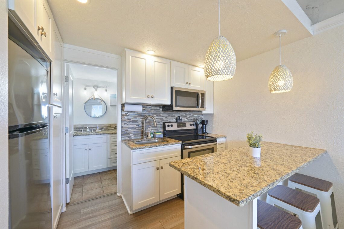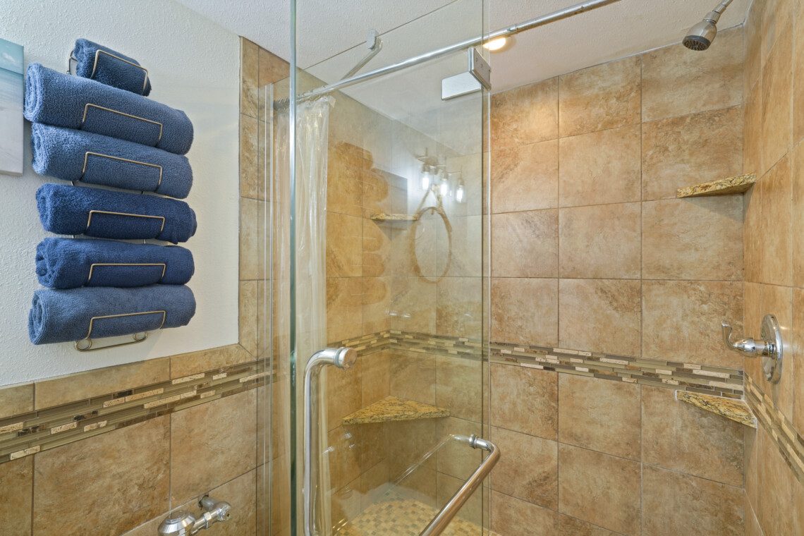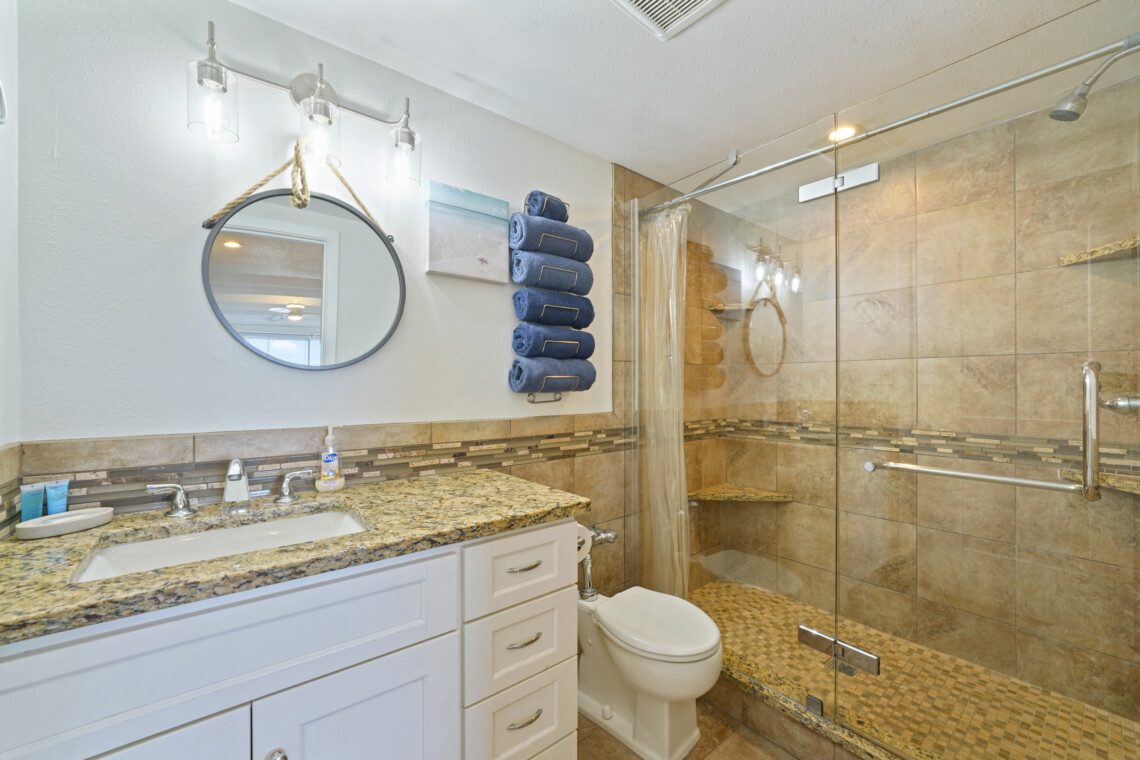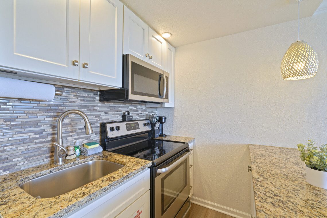 Behind the kitchen is the bathroom with an updated tile walk in shower and upgraded granite vanity. Rinse off the salt and sand before enjoying shopping at Pier Park or dinner within a short walk to Runaway Island!
