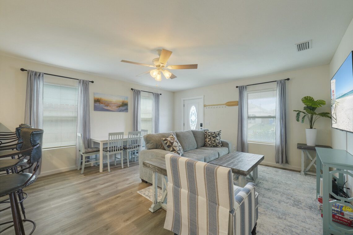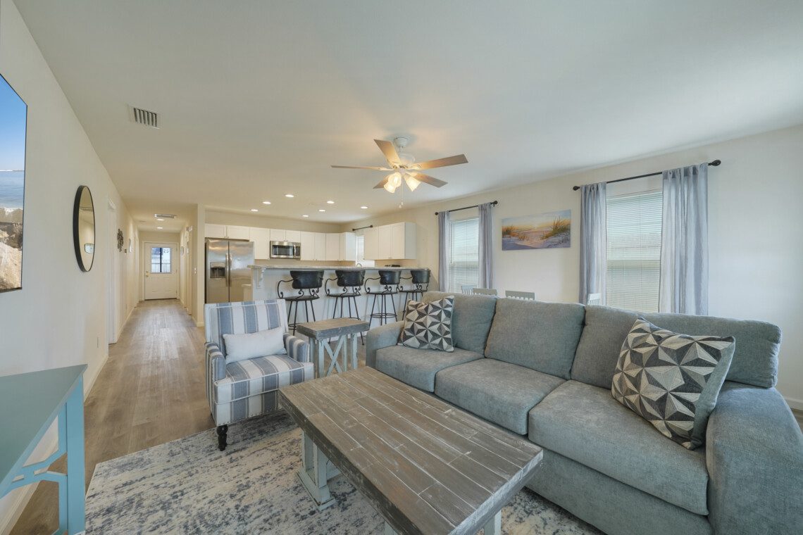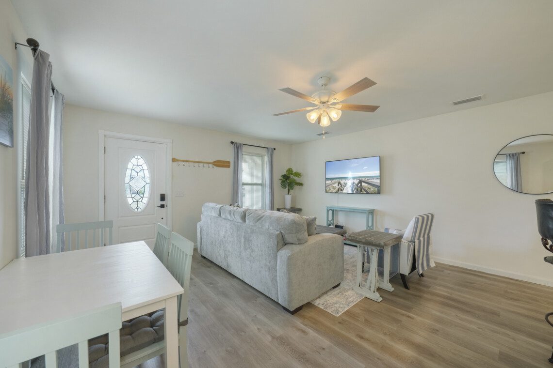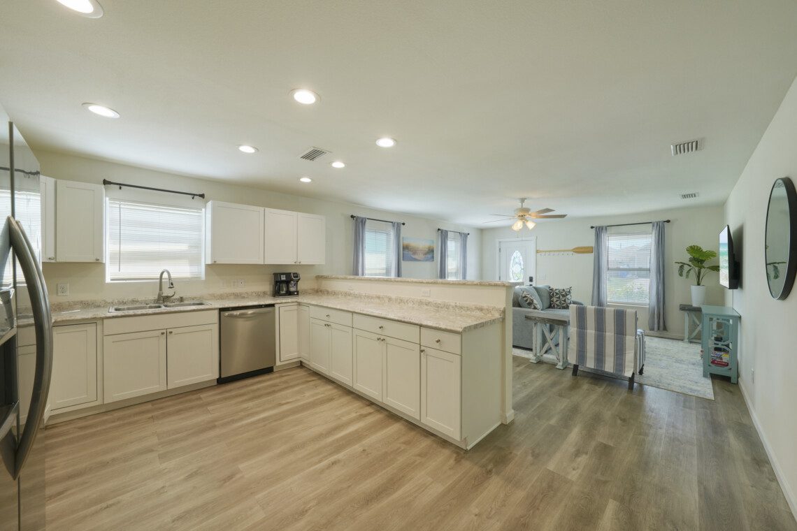 As you enter the home you will notice the bright welcoming interior, comfortable furnishings and coastal decor. The home is newer construction and appointed with modern fixings: oak luxury vinyl plank flooring, stainless appliance, recessed lighting in the kitchen. You will have access to the laundry room off of the kitchen. The three bedrooms are located in down the hallway, beyond the kitchen.