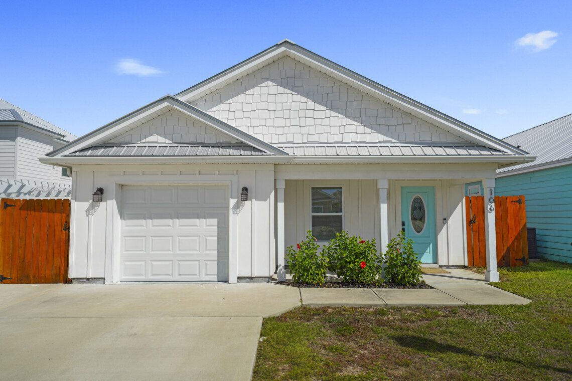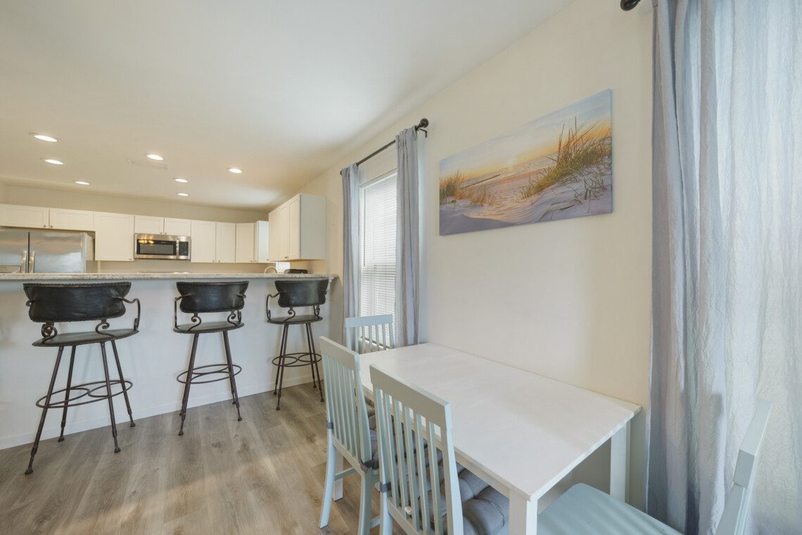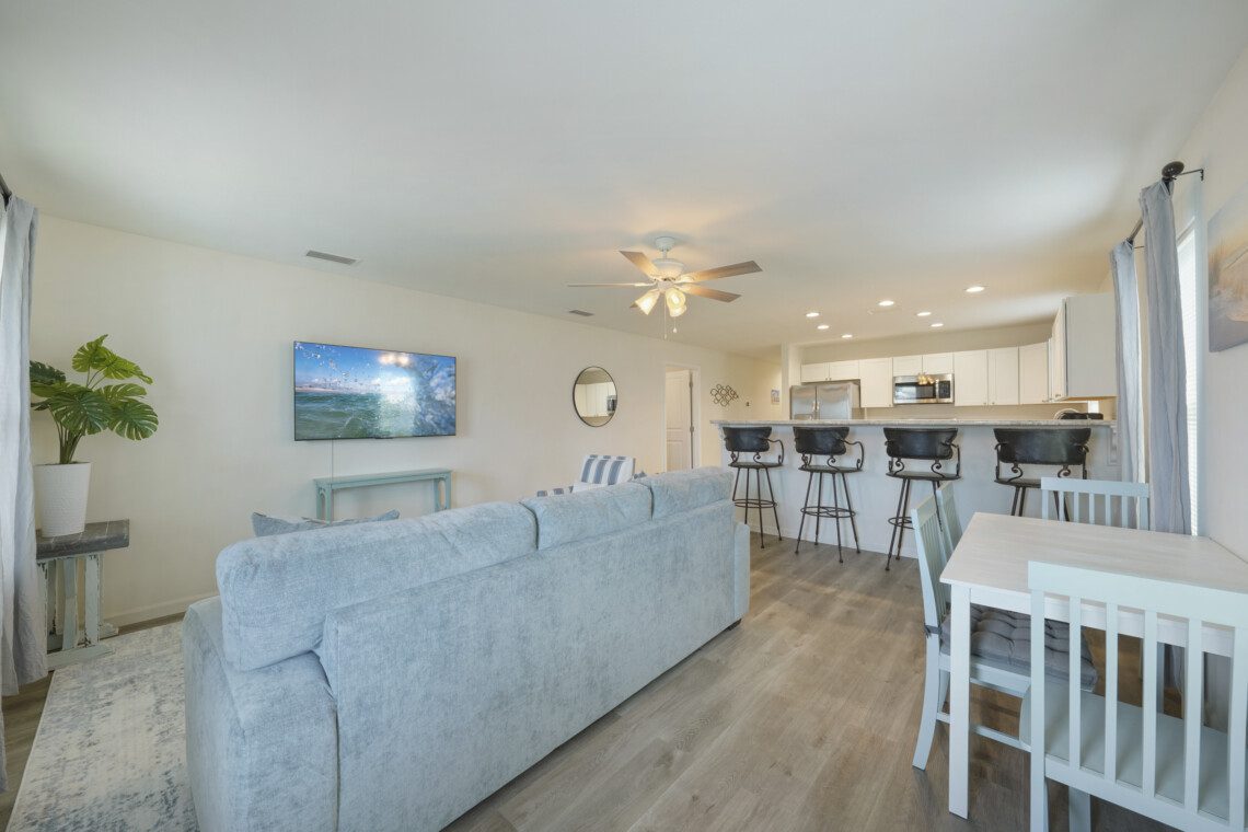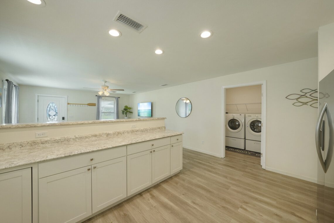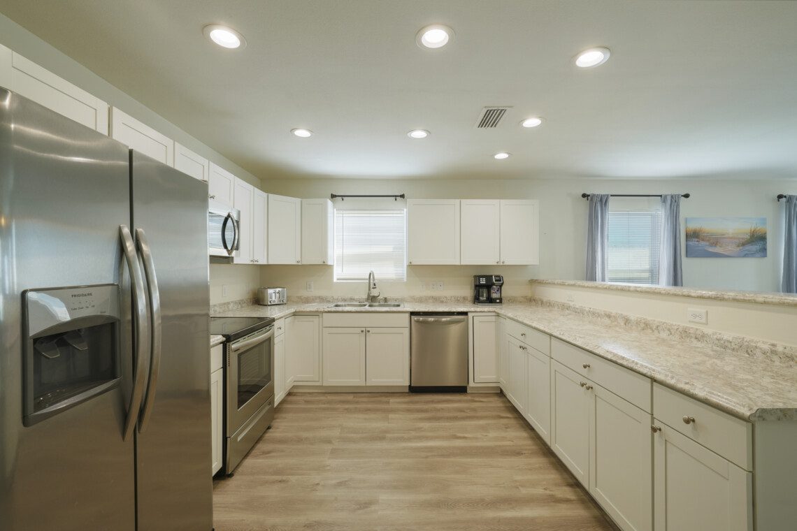 As you enter the home you will notice the bright welcoming interior, comfortable furnishings and coastal decor. The home is newer construction and appointed with modern fixings: oak luxury vinyl plank flooring, stainless appliance, recessed lighting in the kitchen. You will have access to the laundry room off of the kitchen. The three bedrooms are located in down the hallway, beyond the kitchen.