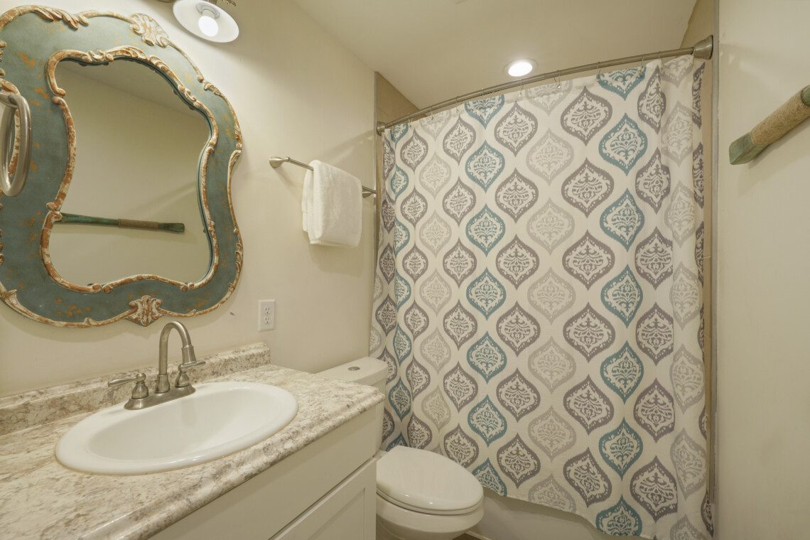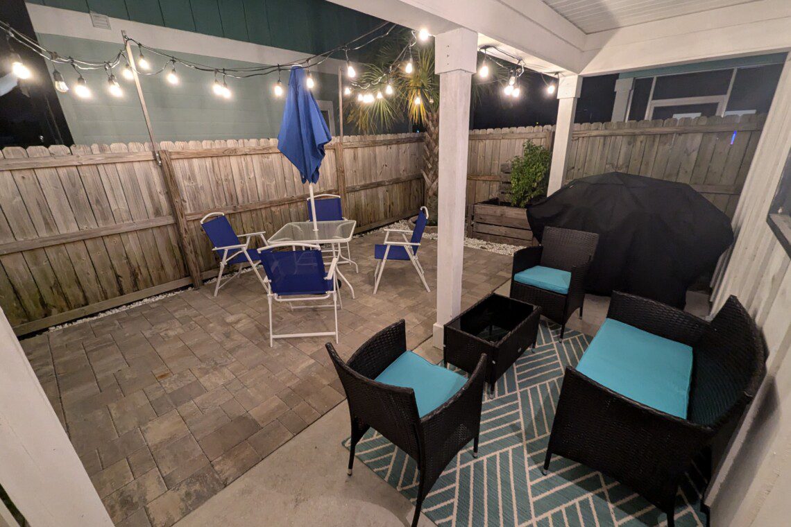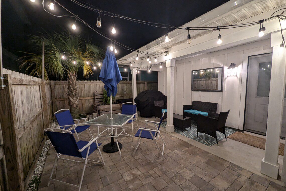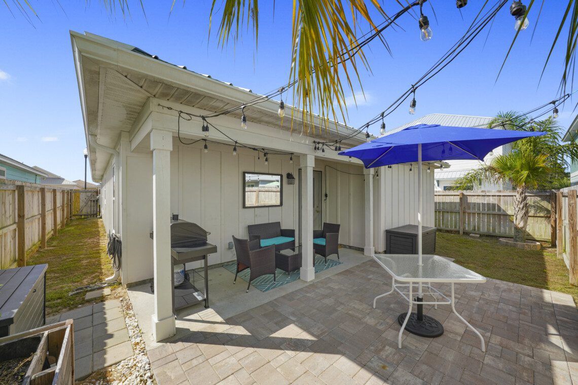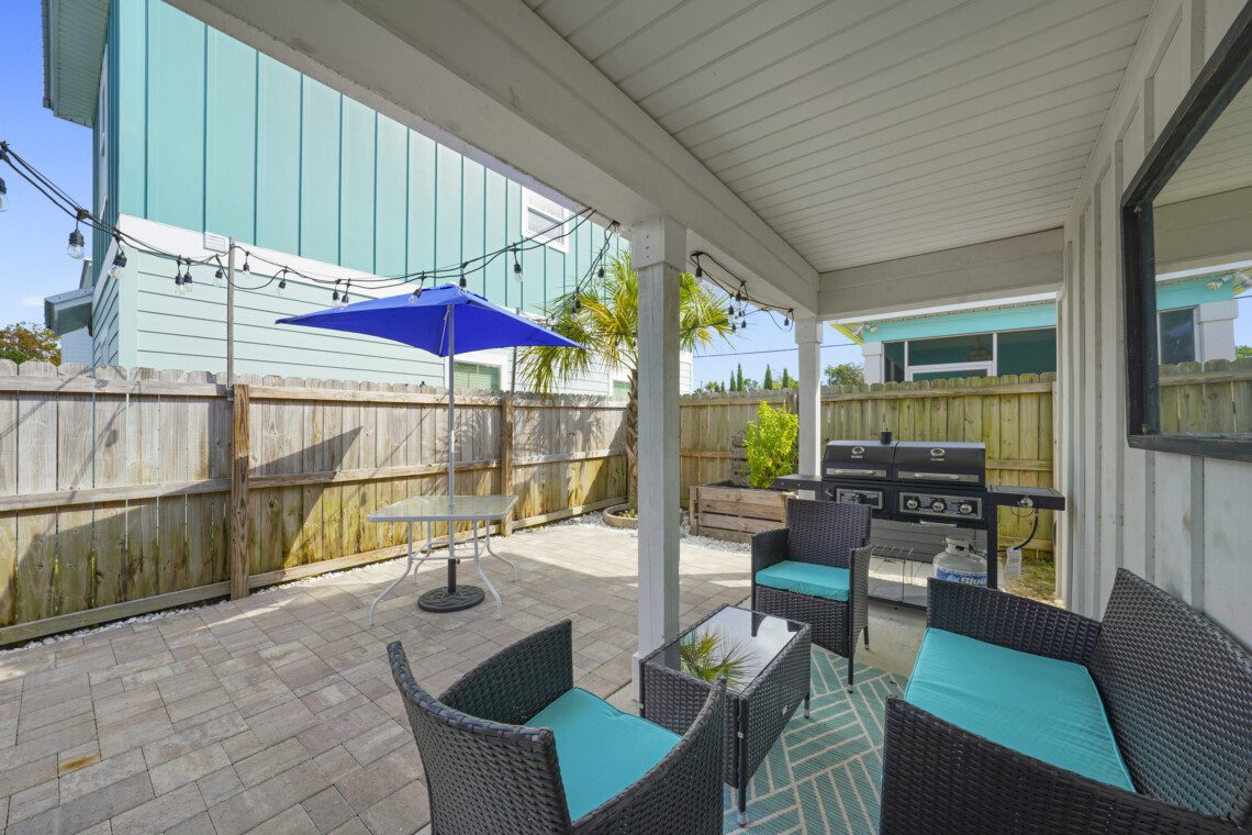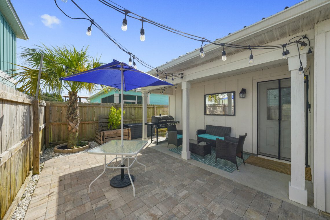 There is a nicely appointed guest bathroom in the hall, along with the queen and bunk bedroom in the hallway. Outside on the back patio, there is nice space to unwind, relax, and enjoy outdoors. There is an outside dining table with an umbrella and a seating area under the covered porch.