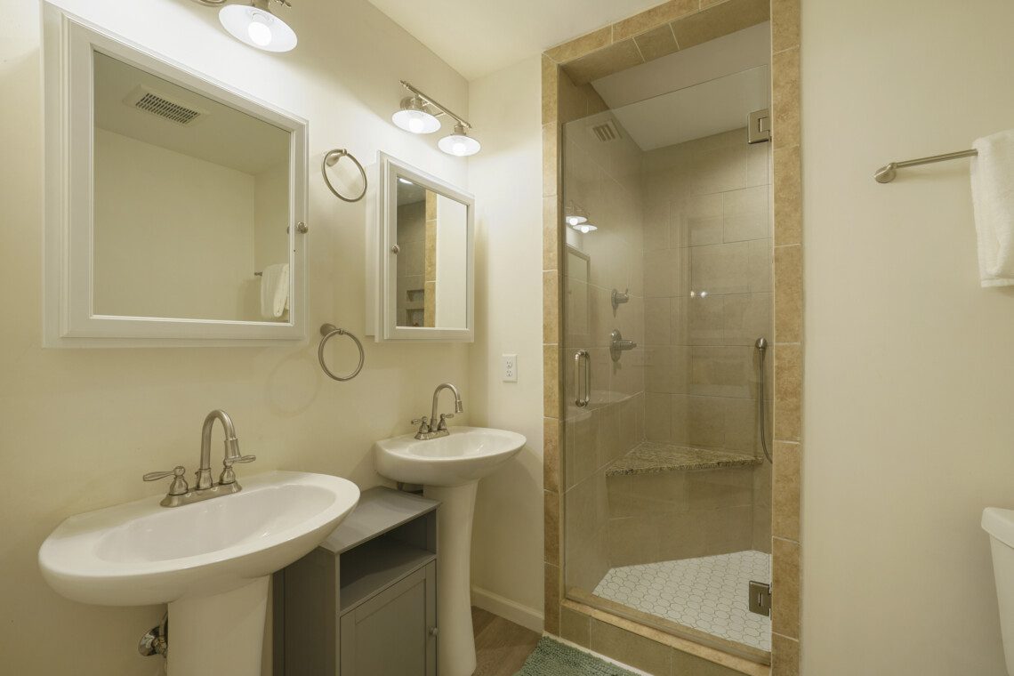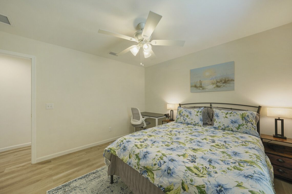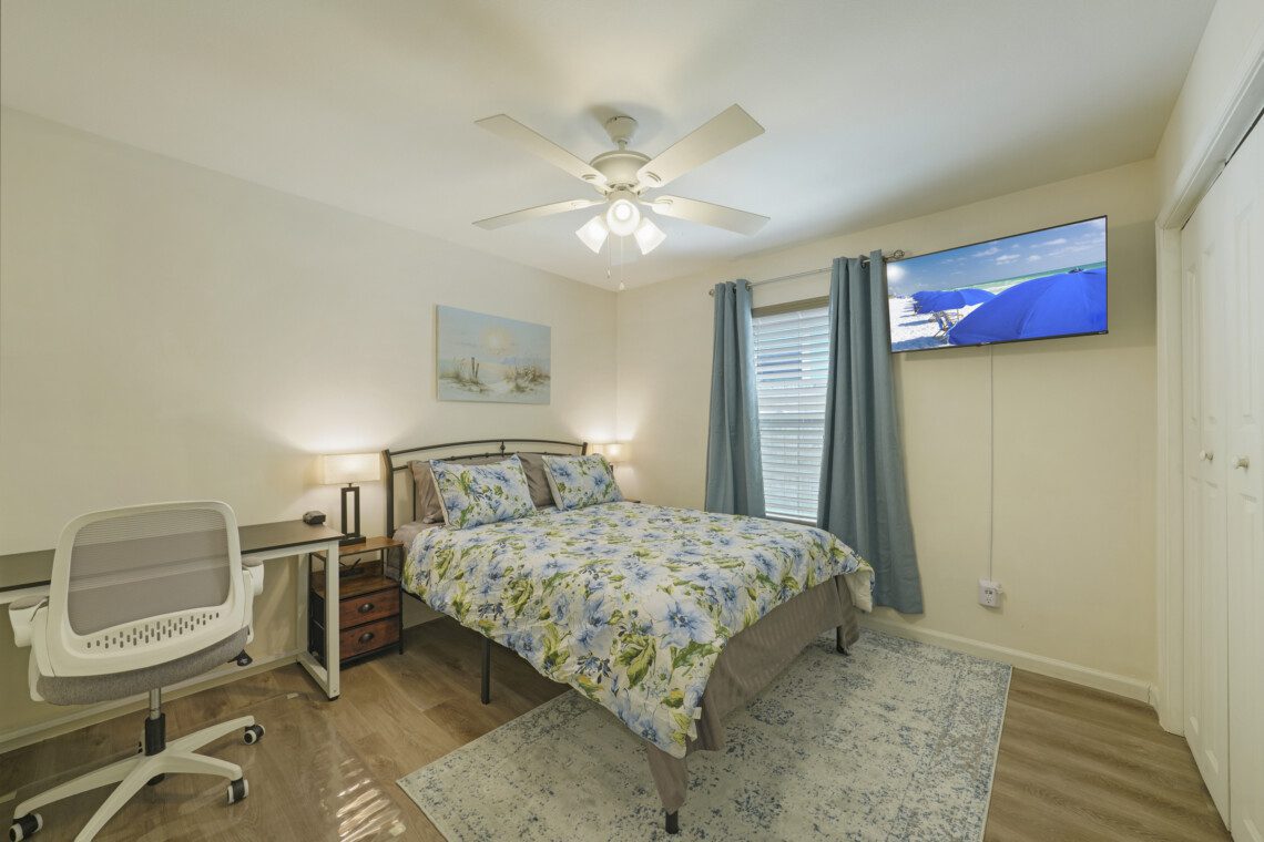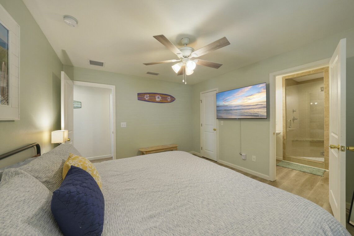 The primary bedroom is appointed with a comfortable king bed. There is an ensuite bathroom with dual vanity and a walk in shower. In the bedroom, there is also a dedicated work desk!
