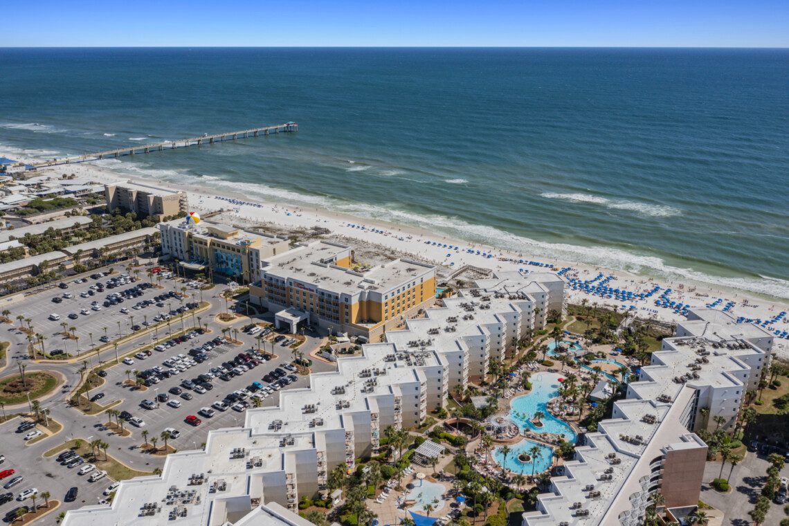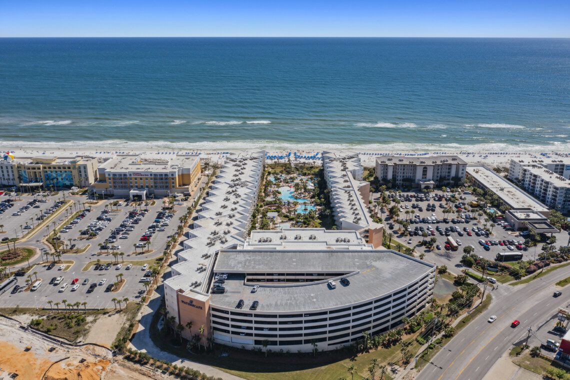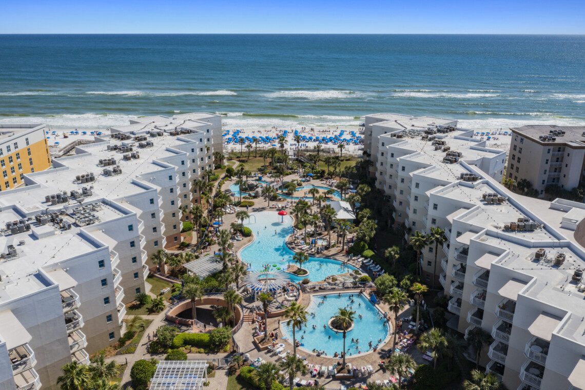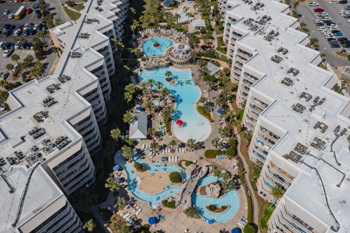 Waterscape Resort, located on beautiful Okaloosa Island, which is well known for its aquamarine waters and quartz-white beaches. Waterscape was built as a U-shaped property to house a veritable oasis-like waterpark in it’s massive courtyard. Waterscape has a two tiered pool deck separated by a 10 foot waterfall. The lower pool deck includes a large zero entry pool with spray toys and lily pads for the little ones. The resort’s lower pool deck features a full sized lazy river for you to float down on inner tubes. The upper deck houses a seasonally heated pool. There is a children’s splash area on the upper pool deck that features toys for toddlers and a covered play area for sun protection. There are two hot tubs located in the tropical oasis for your relaxation.