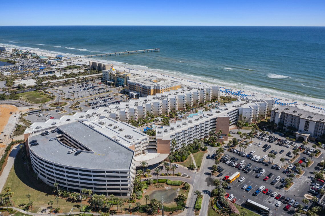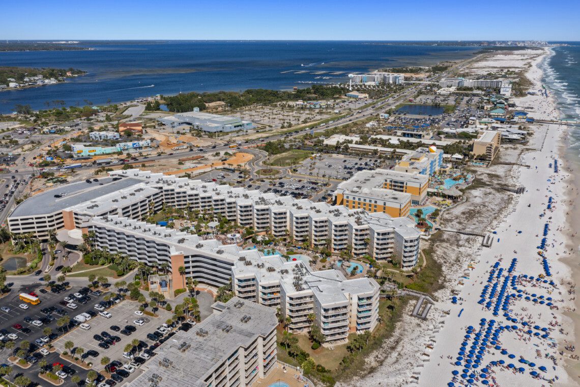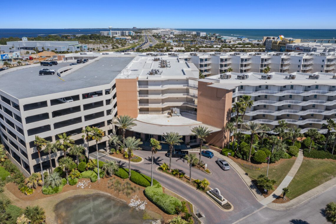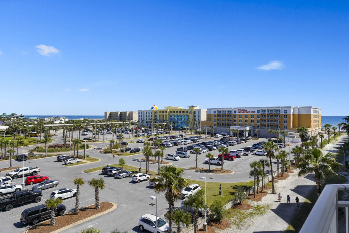 Waterscape Resort, located on beautiful Okaloosa Island, which is well known for its aquamarine waters and quartz-white beaches. Waterscape was built as a U-shaped property to house a veritable oasis-like waterpark in it’s massive courtyard. Waterscape has a two tiered pool deck separated by a 10 foot waterfall. The lower pool deck includes a large zero entry pool with spray toys and lily pads for the little ones. The resort’s lower pool deck features a full sized lazy river for you to float down on inner tubes. The upper deck houses a seasonally heated pool. There is a children’s splash area on the upper pool deck that features toys for toddlers and a covered play area for sun protection. There are two hot tubs located in the tropical oasis for your relaxation.