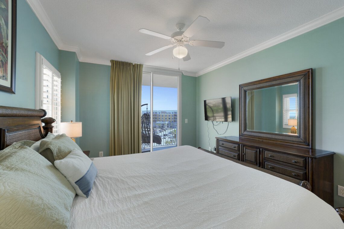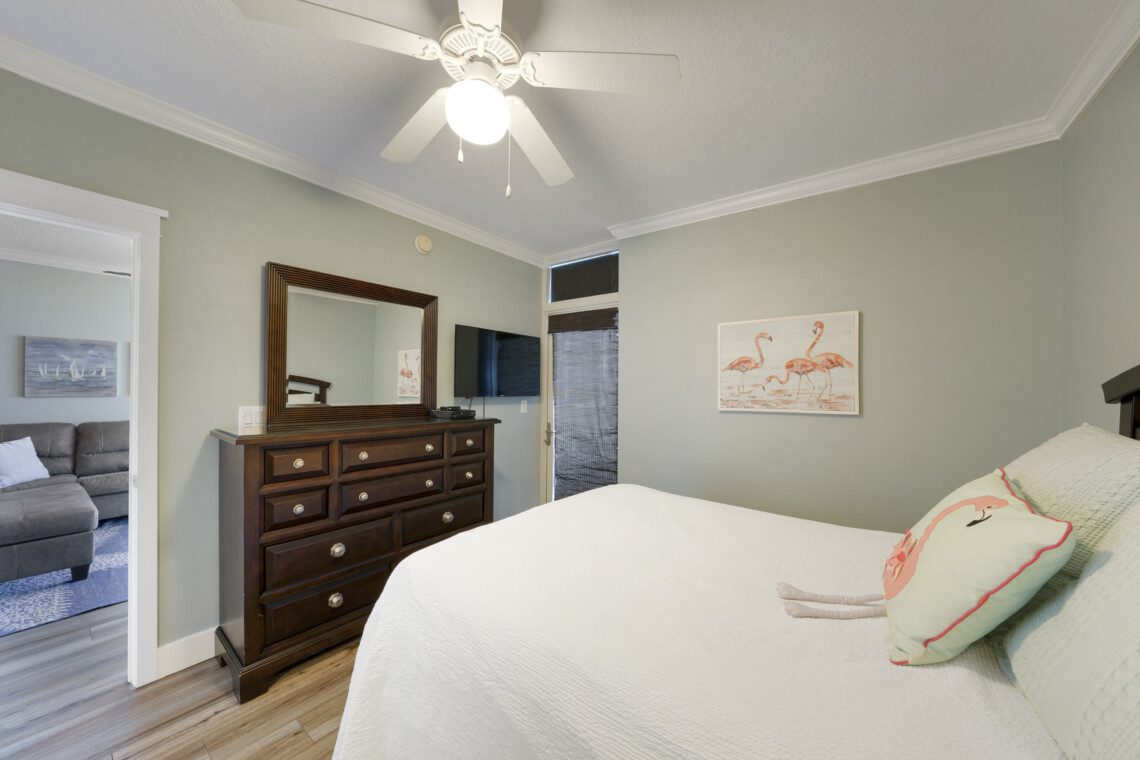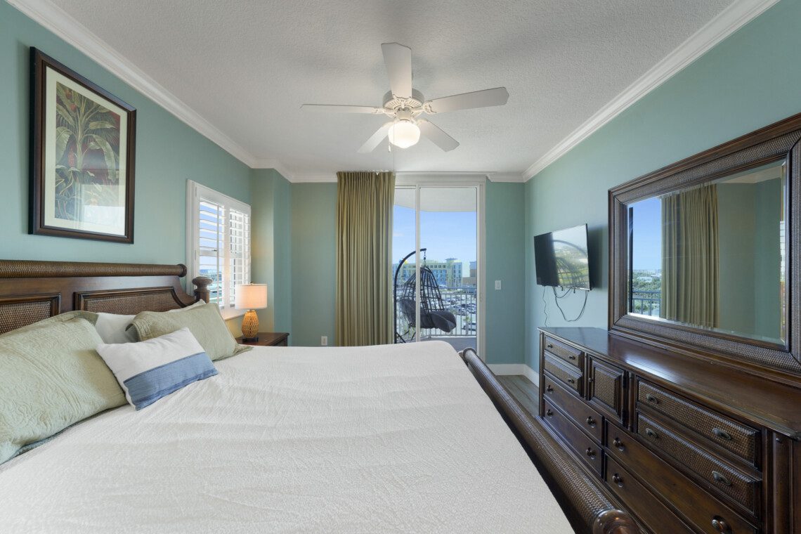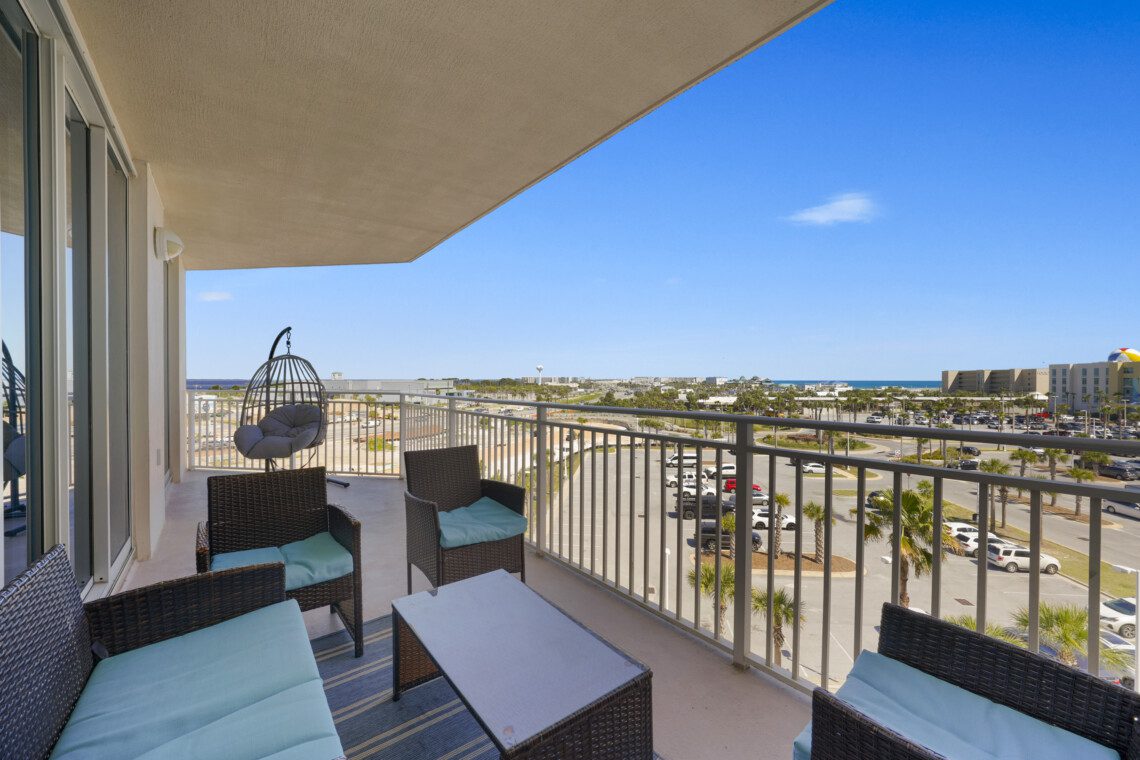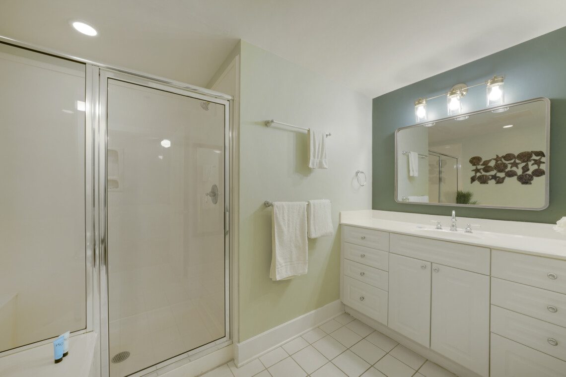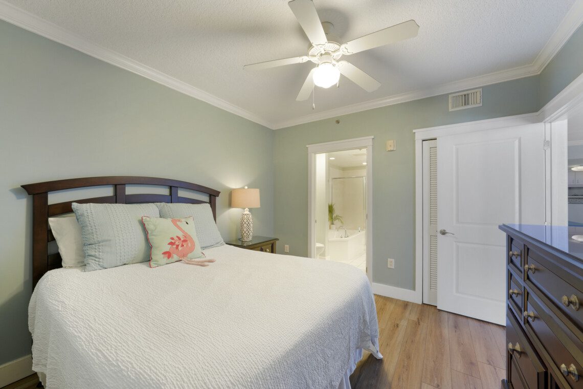 The primary bedroom has a king bed and a massive ensuite bathroom with a large garden tub and a walk-in shower. The guest bedroom is located on the other side of the living area, and includes a queen sized bed. It has an ensuite bathroom with the same accommodations as the primary bath. In the living area there is a queen pull out sofa, bringing the maximum occupancy of this unit to 8. Outside on the balcony expands the width of the unit and can easily accommodate your whole party.