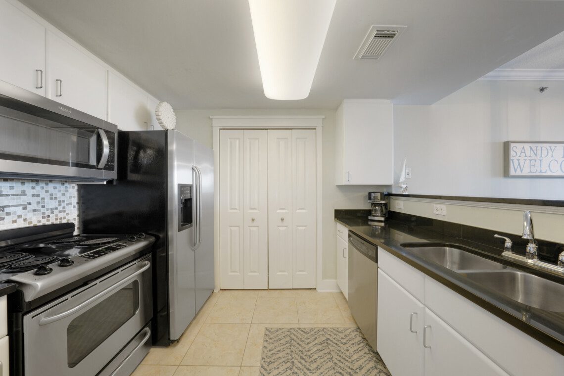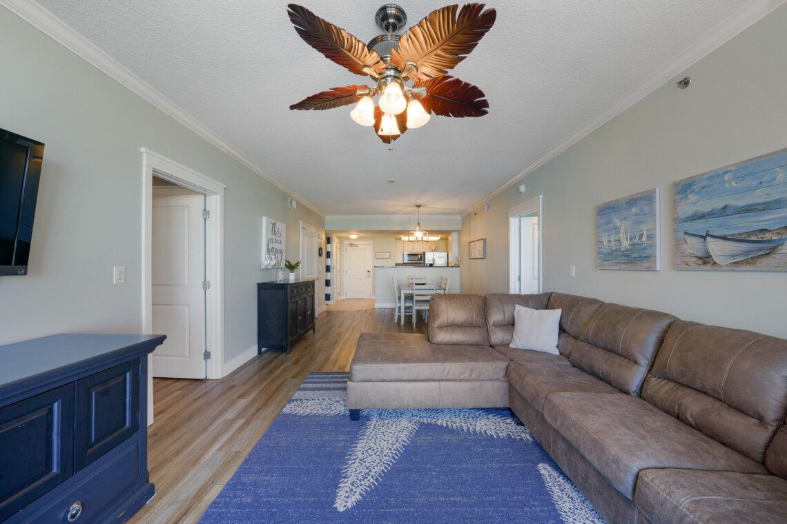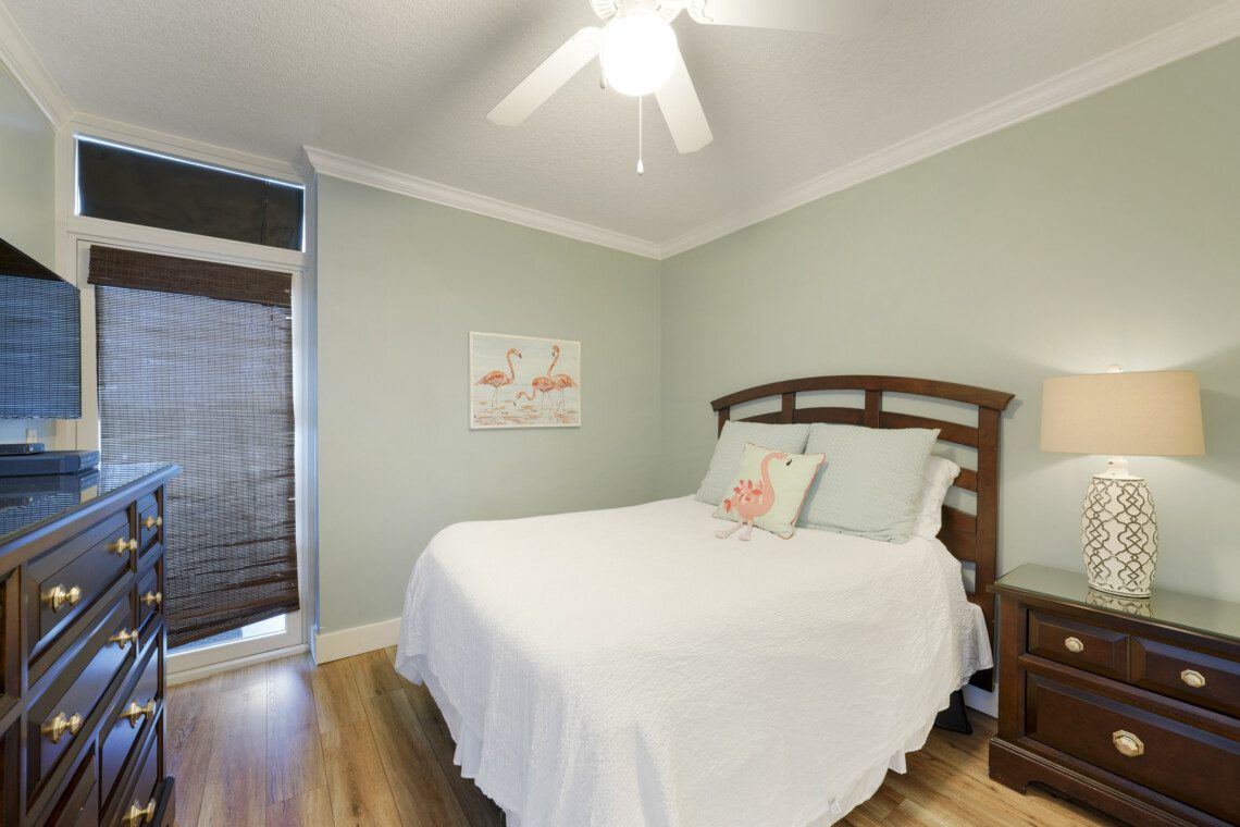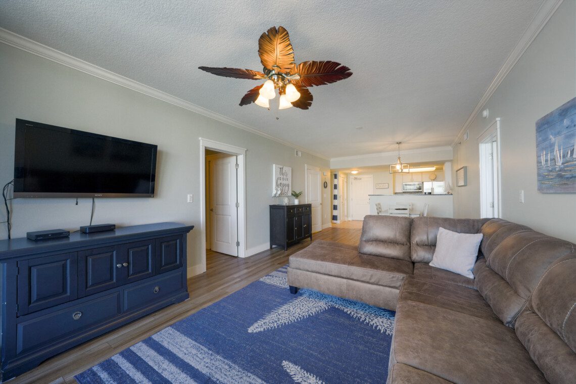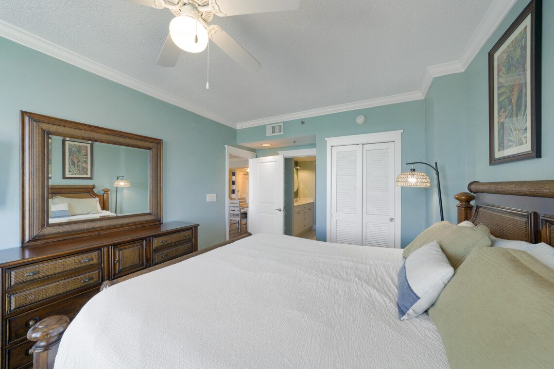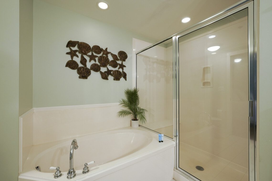 The primary bedroom has a king bed and a massive ensuite bathroom with a large garden tub and a walk-in shower. The guest bedroom is located on the other side of the living area, and includes a queen sized bed. It has an ensuite bathroom with the same accommodations as the primary bath. In the living area there is a queen pull out sofa, bringing the maximum occupancy of this unit to 8. Outside on the balcony expands the width of the unit and can easily accommodate your whole party.